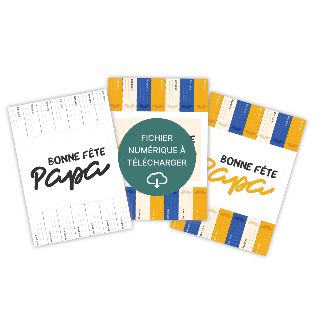 Offrez à votre papa des bons remplis d’amour et de tendresse 💕. Téléchargez, imprimez et personnalisez ces “bons pour…” afin de créer des moments complices et inoubliables ensemble.