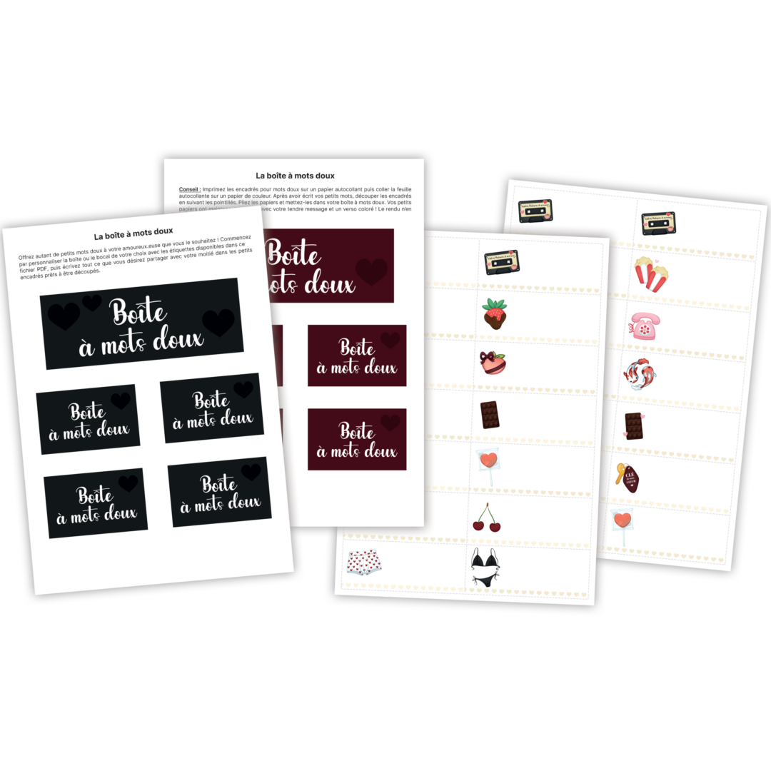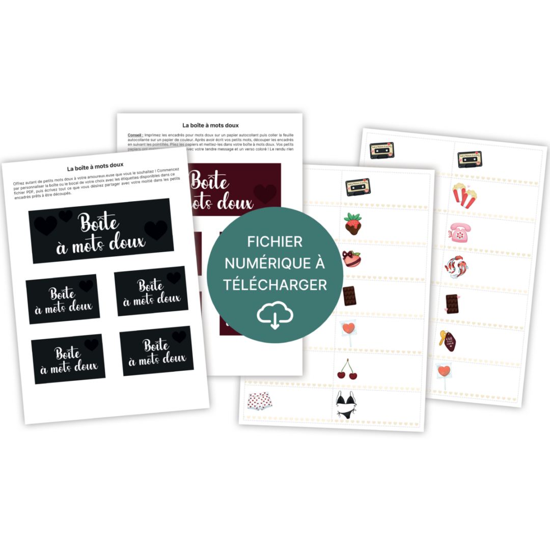 Ce kit à imprimer contient tout le nécessaire pour fabriquer ton propre bocal à mots doux. Sur chaque papier, écris un mot d’amour, une anecdote, un souvenir, une promesse ou un compliment. Ton ou ta partenaire pourra ensuite en piocher un chaque jour, pour illuminer son quotidien de petites attentions sincères.