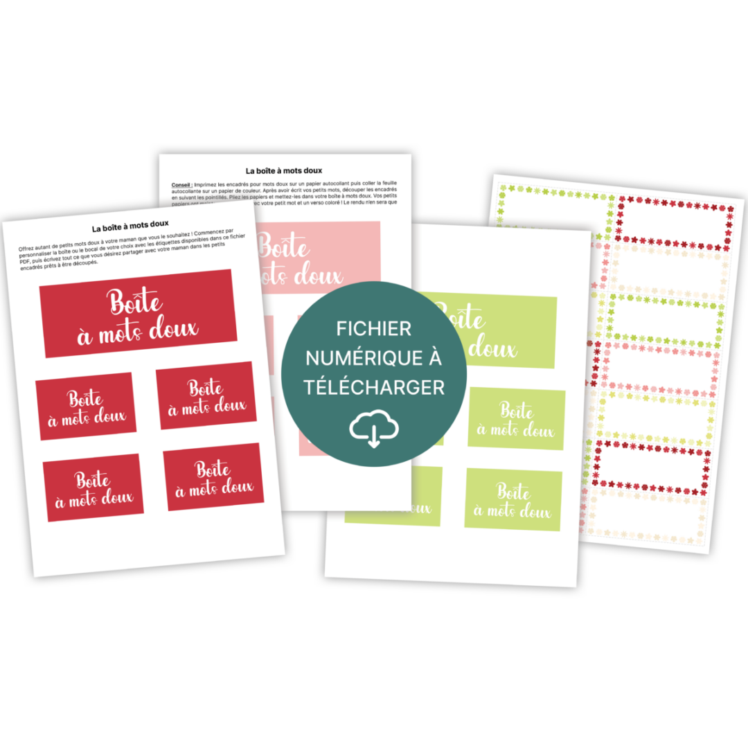 Ce kit à imprimer contient tout ce qu’il faut pour réaliser ton propre bocal à mots doux. L’idée est simple : écris sur chaque papier des petits mots, compliments, souvenirs, messages d’amour ou anecdotes… et glisse-les dans la boîte. Ta maman pourra ensuite en piocher un chaque jour, pour illuminer son quotidien d’un sourire.