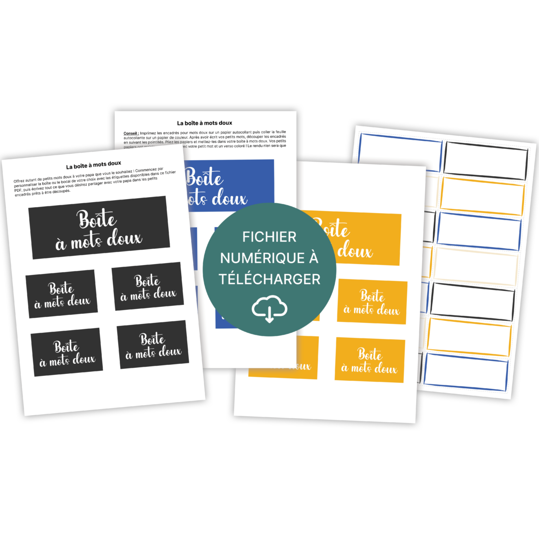 Ce kit à imprimer contient tout le nécessaire pour fabriquer ton propre bocal à mots doux. Le principe est simple : écris sur chaque papier autant de petits mots que tu le souhaites – compliments, souvenirs, remerciements, blagues, messages tendres… – puis offre la boîte à ton papa. Chaque jour, il pourra en piocher un et se régaler d’un mot plein de bonheur.