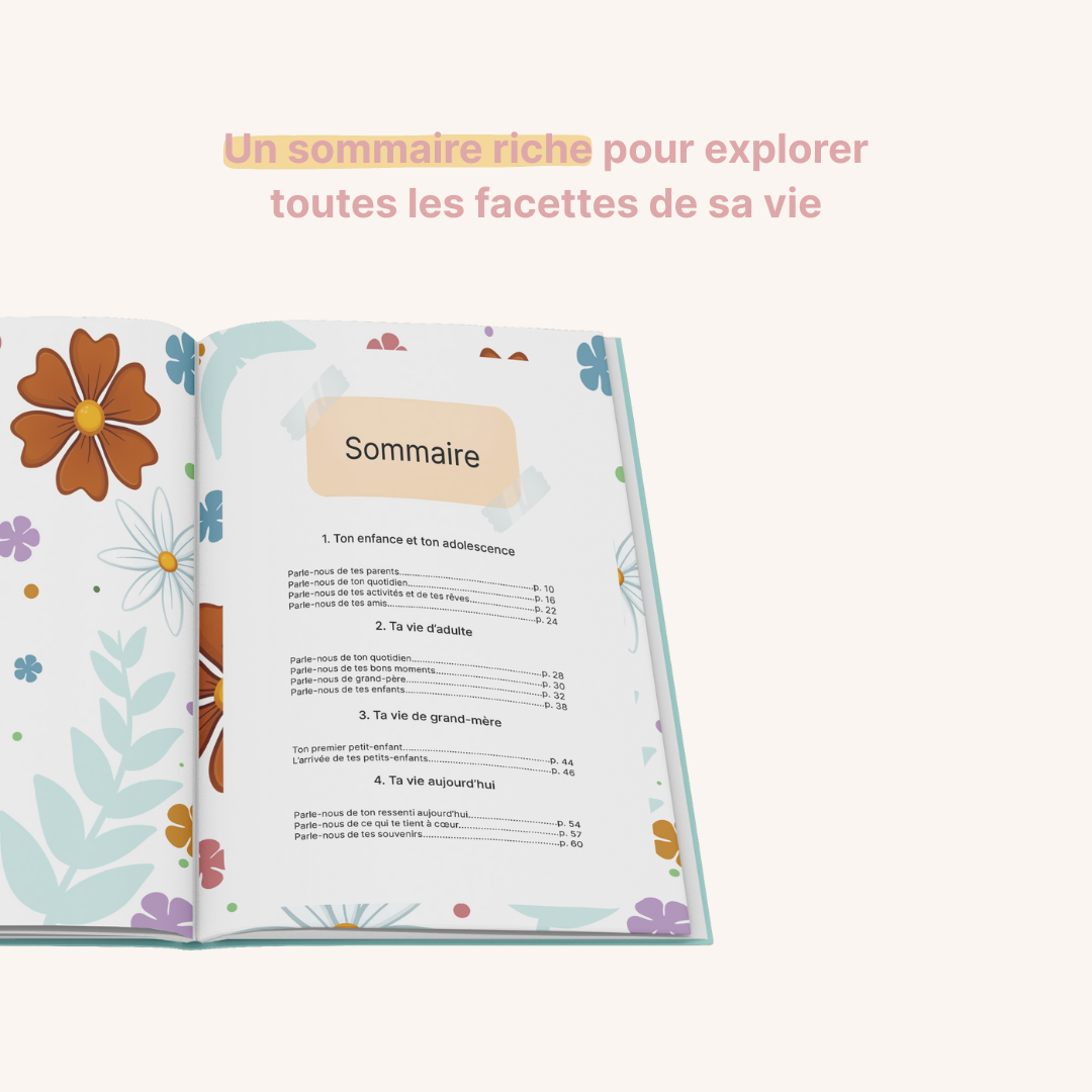 Chaque livre contient des questions guidées qui facilitent l’écriture. Il suffit de prendre un stylo et de répondre pas à pas. Aucun besoin d’inspiration particulière : les questions sont là pour éveiller les souvenirs et guider la personne tout au long du livre.