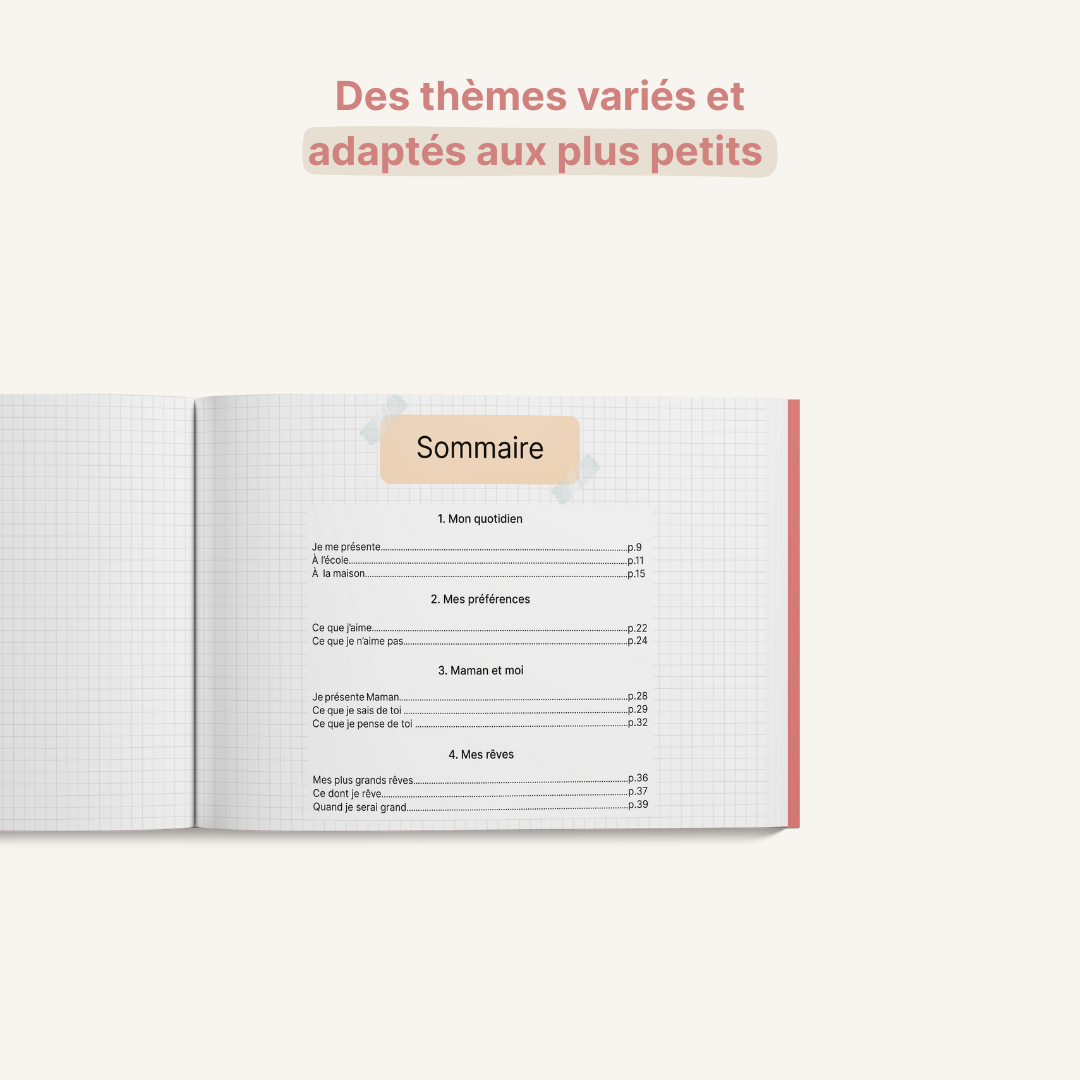 • Maman et moi: Des pages pour exprimer ce qu'il sait de sa maman et ce qu'il ressent envers elle.